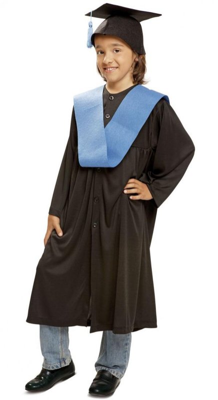 Součástí kostýmu absolvent je čepice, róba a šerpa. Černá dlouhá široká róba s dlouhými rukávy je na zapínání na černé knoflíky. Černá absolvenstká čepice má modrý střapec. Kolem krku je široká modrá šerpa.
