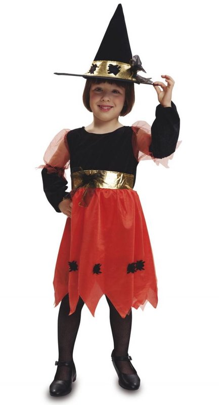 Součástí kostýmu jsou šaty s průhlednými červenými rukávy a sukní s našitými pavouky, černý klobouk se zlatým páskem s pavouky a ozdobnou černou mašlí, zlatý pásek s černou mašlí.