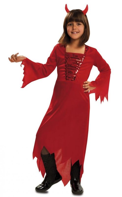 Součástí kostýmu jsou dlouhé červené šaty s flitrovou vsadkou na hrudníku a flitry zdobeným lemem a dlouhými rozšířenými rukávy. Červené rohy.