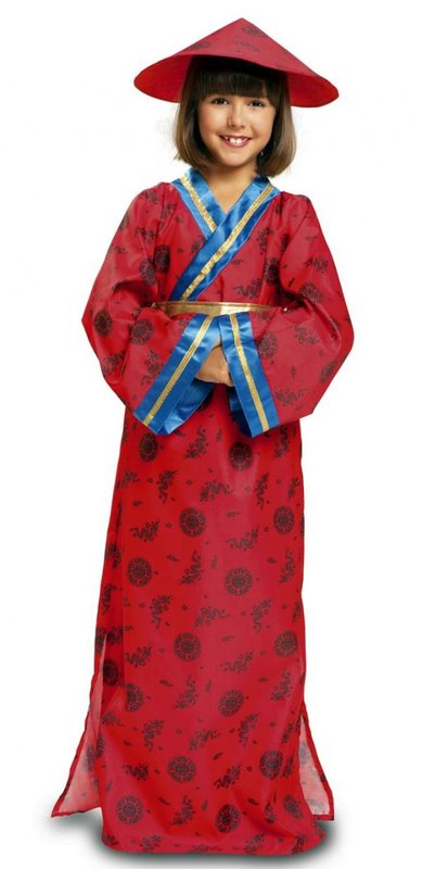 Součástí kostýmu je klobouk, šaty a pásek. Červené dlouhé šaty s černými čínskými motivy jsou s dlouhými rukávy, které mají širokou světlemodrou manžetu se zlatým proužkem stužky. Stejné lemování je i kolem výstřihu. Šaty mají na každé noze rozparek ke kolenům. Kostým doplňuje zlatá šerpa a červený čínský klobouk s černými motivy.