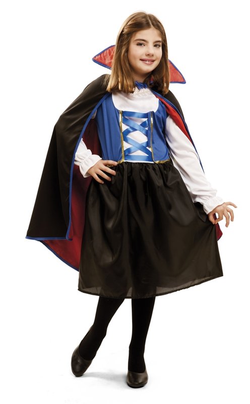 Součástí kostýmu upírky Dráculy je plášť a šaty. Šaty s dlouhými bílými rukávy, které mají kolem zápěstí volánek. Vrchní díl šatů je modrý, tvořící dojem vestičky, která je lemovaná zlatou stužkou a má modré šněrování. Vsadka a výstřih jsou bílé, u krku s malým volánkem. Sukně je černá, mírně nařasená. Kostým upírky doplňuje černý plášť lemovaný modře s velkým stojacím límcem. Plášť upírky je podšit červenou látkou.