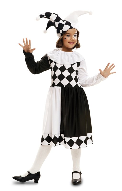 Součástí kostýmu je čepice a šaty. Bíločerné šaty mají jeden dlouhý rukáv bílý, druhý černý. Na hrudníku jsou šaty kárované. Sukně je rozdělena na černý a bílý díl. Spodní lem sukně je károvaný. Kolem krku je velký bílý volánek. Klaunská čepice má tři špičky s bambulkou. Jednu bílou, druhou černou a třetí károvanou. Rukávy jsou ve spodní části stažené do gumy a tvoří tak malý volánek.