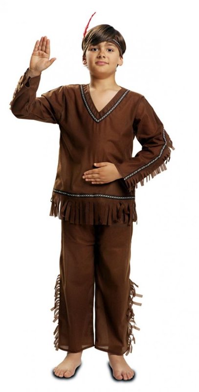 Součástí kostýmu indiány je čelenka, košile a kalhoty. Tmavohnědá košile s dlouhým rukávem má třásňový spodní lem i boční šev rukávů, který je zdoben modrou stuhou se světlými křížky. Stejná stuha je i na spodním lemu košile, na výstřihu a čelence, která je doplněna barevným perem. Tmavohnědé indiánské kalhoty mají od kolen dolů v bočním švu všity třásně.