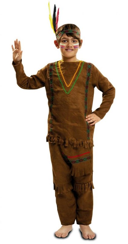 Součástí indiánského kostýmu je čelenka, košile a kalhoty. Tmavohnědé kalhoty mají pod koleny našity třásně stejné barvy. Košile s dlouhými rukávy je taktéž z tmavohnědé látky. Spodní lem indiánské košile je z třásní. Výstřih je zdoben žlutou, zelenou a světlehnědou vlnitou stužkou. Na bocích hrudníku jsou dva svislé pruhy ozdobné barevné stuhy.