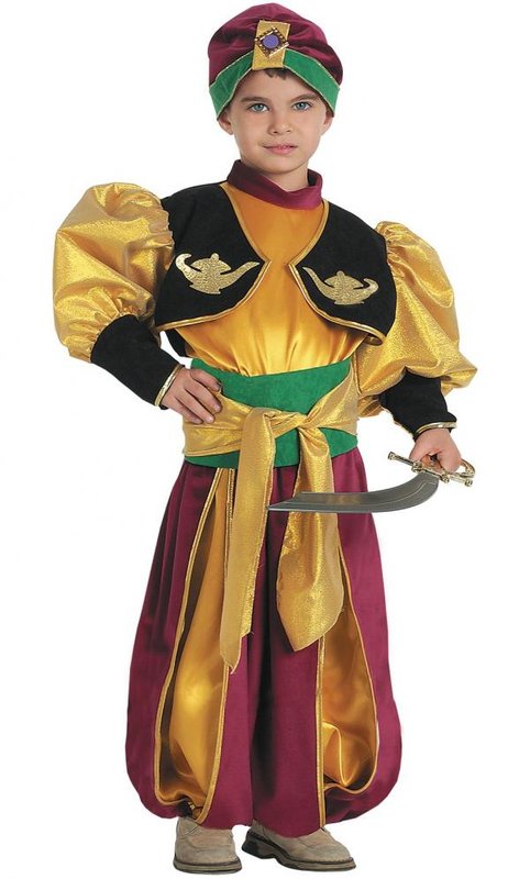 Součástí kostýmu je žaket, top, kalhoty, čepice a pásek. Zlatý lesklý top má stojací vínový límeček. Černý krátký žaket je zlatě lemovaný a v přední části má nalepené dvě zlaté aladinovy lampy. Dlouhé zlaté nabírané rukávy mají široké černé zlatě lemované manžety. Kolem pasu je široká zalená šerpa se zlatým pruhem látky na zavázání. Vínové široké kalhoty mají na každé noze v přední části velký zlatě lemovaný rozparek, který je podšitý zlatou látkou. Kostým doplňuje vínový turban se zeleným okrajem, zlatým proužkem a zlatomodrou broží.