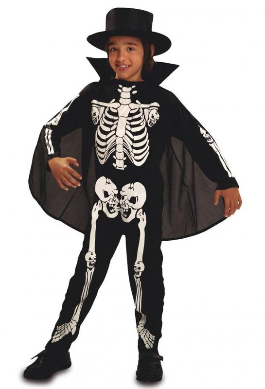 Součástí kostýmu kostlivce na halloween je dlouhý černý overal s motivem kostry, černý plášť se stojacím límcem, černý klobouk.