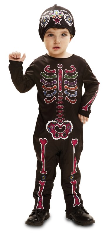 Součástí kostýmu kostlivky je overal a čepice. Černý overal s dlouhými rukávy má v přední části natištěné barevné kosti zdobené kytičkami a ornamenty. Kostým doplňuje černá čepice zdobená barevnými ornamenty.