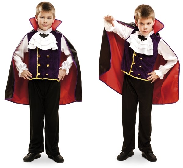 Součástí dětského kostýmu upíra je košile, plášť, fiží a kalhoty. Fialová košile s bílými dlouhými rukávy, které mají u zápěstí malý volánek. Na pravé straně hrudníku je svislý proužek zlaté stužky, který je i na spodním lemu košile. Ta je zdobena šesti zlatými knoflíky. Kostým doplňují černé dlouhé kalhoty, bílé fiží s černým netopýrem a černý plášť s velkým stojacím vpředu červeným vzadu černým límcem. Plášť upíra je podšitý červenou látkou.