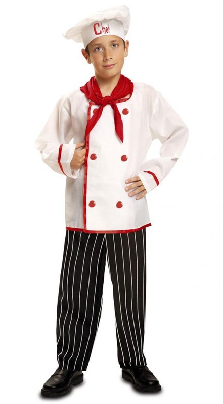 Součástí kostýmu kuchaře je čepice, šátek, košile a kalhoty. Bílá košile s dlouhým rukávem, který je ozdoben červeným proužkem. Stejným proužkem je lemován výstřih, zapínání a spodní lem košile. Na hrudníku je šest červených knoflíků. Kolem krku je črvený šátek. Ke kostýmu patří také černé kalhoty s bílými proužky a bílá kuchařská čepice s červeným nápisem CHEF.