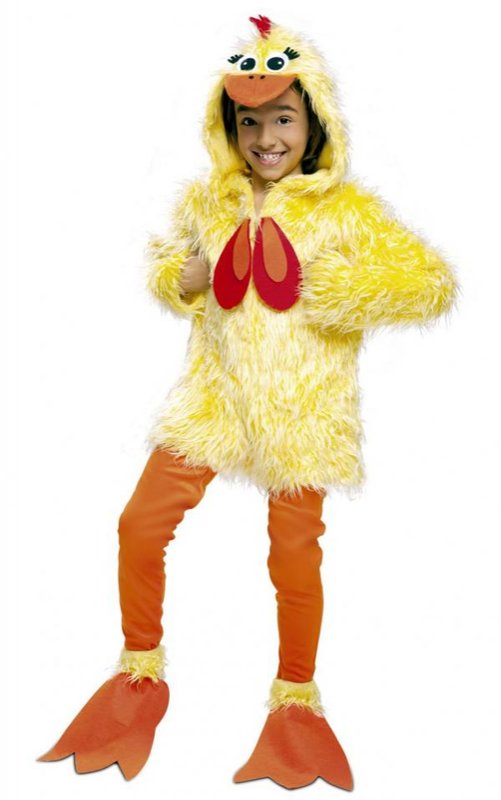Součástí kostýmu je overal s kapucí a návleky na nohy. Overal má jako spodní díl oranžové úzké kalhoty, vrchní díl je žlutý chlupatý s dlouhými rukávy a kapucí. U krku jsou přišité dvě červenooranžové kapky. Na kapuci je oranžový zobák, červený kuřecí hřebínek a bíločerné oči. Kostým doplňují oranžové pruhy látky ve tvaru drůbežích nohou přišité ke žlutému chlupatému pásu látky kolem kotníků. V zadní části overalu je přišit červený ocas.