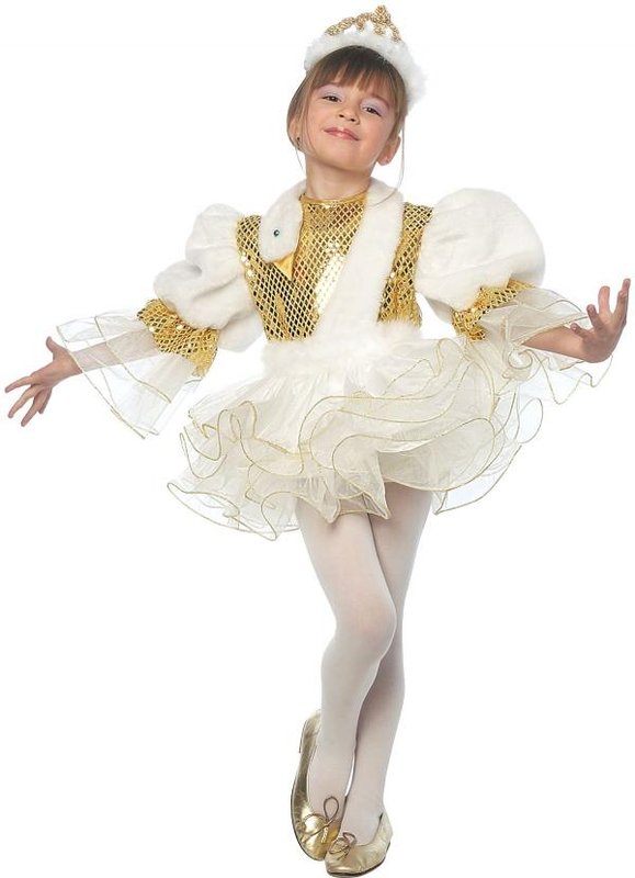 Součástí kostýmu je korunka a šaty. Krátké šaty mají vrstvenou nabíranou sukni z bílé průhledné látky lemovanou zlatě. Vrchní sukně je bílá lesklá. Kolem pasu je péřový bílý pásek. Vrchní díl šatů je zlatý flitrový. Rukávy mají vrchní část nabíranou chlupatou. U loktů je našit volánek ze zlaté flitrové látky. Pod ním jsou našity dva průhledné bílé zlatě lemované volánky. Od pásku vede kolem krku chlupatý krk labutě ukončený labutí hlavou se žlutým zobákem a okem. Ke kostýmu patří také zlatá čelenka s bílým peřím.