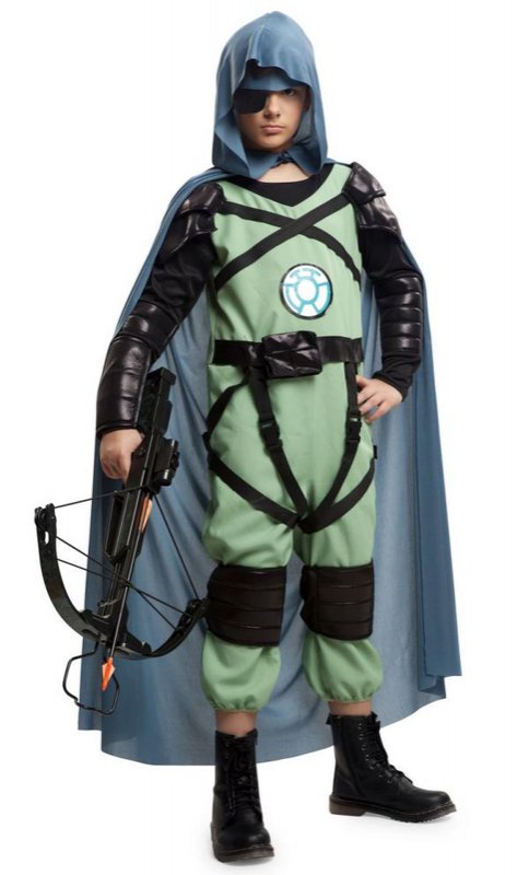 Součástí kostýmu je plášť s kapucí, overal s pásky a chrániči ramenou a předloktí, chrániče kolen a čelenka s klapkou na oko.