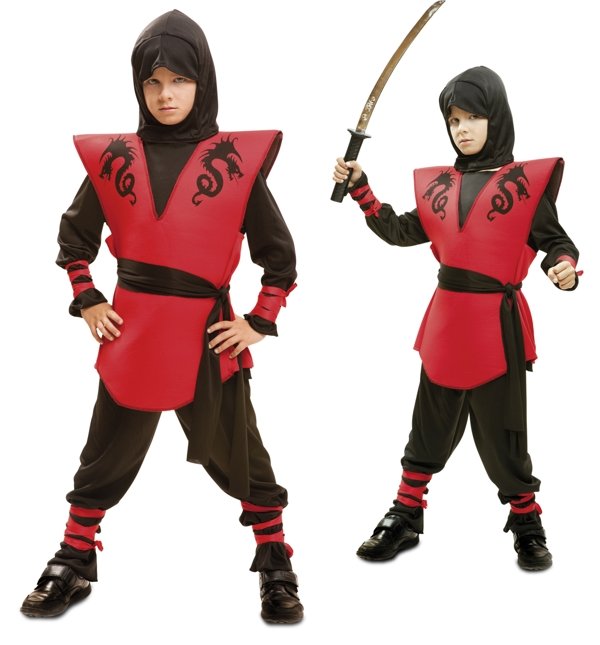Součástí kostýmu ninja je kapuce, košile, kalhoty, štít, písek a stuhy. Černá košile s dlouhými rukávy je doplněna černou kapucí. Přes košili je červený štít s výstřihem do V a s černými draky na každém rameni. Kolem pasu je černý pásek na zavázání. Černé kalhoty, stejně jako košile, jsou ozdobeny červenými stuhami na zavázání.