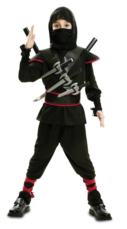 Součástí kostýmu je kapuce, maska, košile, pásek s pouzdry a kalhoty. Černé tričko s dlouhými rukávy, které mají kolem zápěstí šňůrky na omotání. Na ramenou jsou černé červeně lemované výložky. Kolem pasu je černý červeně lemovaný pásek. Kostým doplňuje černá kapuce, černá maska, černé dlouhé kalhoty s červenými stužkami na omotání holení a pásky přes hrudník s úchyty na nože a šavle. ( Nože a šavle nejsou součástí kostýmu )