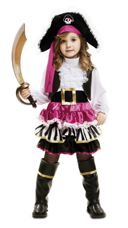 Součástí kostýmu je klobouk, fiží, košile s vestou, sukně, pásek a návleky na boty. Bílá košile se stojacím límečkem a dlouhými rukávy, které mají u zápěstí malý volánek. Ke košili je našitá černá vestička. Kolem krku je krajkové fiží. Sukně je vrstvená ze tří volánků. Vrchní je růžový lemovaný bílou krajkou, druhý je bíločerný pruhovaný lemovaný zlatě a spodní je černý růžově lemovaný. V pase je široký černý pásek se zlatou látkouvou sponou. Kostým doplňuje černý pirátský klobouk s růžovou stuhou a natištěnou bílou lebkou v přední části. Horní lem klobouku je lemovaný bílou krajkou. Na boty jsou vysoké černé návleky se zlatou stuhou.