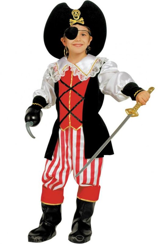 Součástí dívčího kostýmu pirátky je žaket, kalhoty, klobouk a boty. Dlouhý černý žaket má velký bílý límec se zlatým lemováním a bílou krajkou. dlouhé rukávy jsou také bílé s širokou černou manžetou s ozdobným zlatým proužkem. Na hrudníku je červená zlatě lemovaná vsadka s naznačeným černým šněrováním. Kostým doplňují červenobílé pruhované kalhoty, černé boty s širokým červeným zlatě lemovaným lemem a černý pirátský klobouk se zlatou lebkou se zkříženými hnáty.