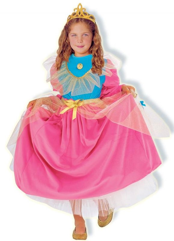Součástí kostýmu je korunka a šaty. Dlouhé sametové šaty mají růžovou sukni s bílou spodničkou. Kolem pasu je pásek ze zlaté stuhy s mašlí. K ní je přišita vrchní kratší průhledná zlatá sukně s rozparkem k pasu. Vrchní díl je světlemodrý s růžovými dlouhými rukávy. Na hrudníku je zlatá brož a velký zlatý průhledný volán. Kostým je doplněn zlatou korunkou.