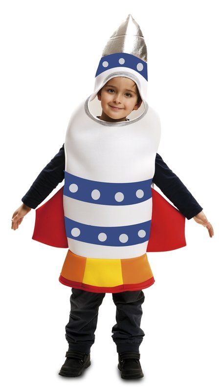 Součástí kostýmu je overal. Overal ve tvaru rakety má po stranách otvory na ruce. Pod nimi jsou červená křídla. Na bílé raketě jsou na břiše dva modré pruhy s bílými kolečky. Spodní lem je oranžovožlutý, červeně lemovaný a vytváří dojem ohně. Overal má otvor na obličej lemovaný stříbrně. Na hlavě je stříbrná špička a modrý pruh s bílými kolečky.