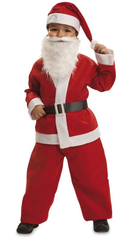 Součástí dětského kostýmu Santa Claus je červený žaket s bílým lemováním, červené kalhoty, černý pásek s bílou sponou, červená čepice s bílým lemem a bílou bambulí, bílý plnovous na gumičku.