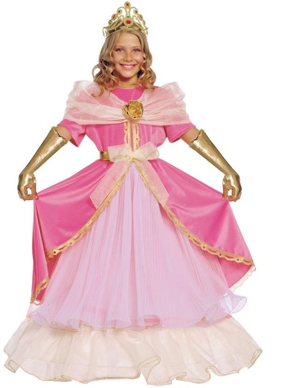 Součástí kostýmu je koruna a šaty. Dlouhé růžové šaty s krátkým rukávem mají výstřih lemovaný zlatou stužkou. Přes ramena je nařasený průhledný krémový šál, který je na hrudníku spojen do zlaté růžičky. Vrstvená sukně s obručí má spodní vrstvu krémovou s velkým zlatě lemovaným volánem. Další vrstva je o něco kratší zlatě lemovaná světlerůžová průhledná a skládaná. Nejvrchnější sukně je růžová s rozparkem až k pasu a je lemovaná hrubou zlatou krajkou, která přechází ze sukně na hrudník. Kolem pasu je zlatý pásek s velkou krémovou průhlednou zlatě lemovanou mašlí. Kostým doplňuje zlatá korunka s barevnými kamínky.