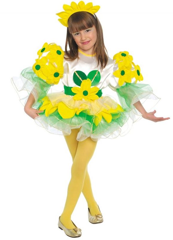 Součástí kostýmu je čelenka a šaty. Krátké šaty mají vrstvenou volánovou sukni. Spodní volány jsou průhledné zlatě lemované bílé a zelené. Předposlední volán je žlutý ve tvaru okvětních lístků. Na něm je bílý průhledný volán. Kolem pasu je zelený pásek s velkou žluto zelenou kytkou. Stejné kytky jsou i na nabíraných bílých rukávech, které mají od loktů dolů našit průhledný bílý a zelený volán. Vrchní díl šatů je bílý u krku žlutě lemovaný. Na hrudníku jsou našity dva zelenozlaté listy. Kostým doplňuje žlutá čelenka s okvětními lístky.