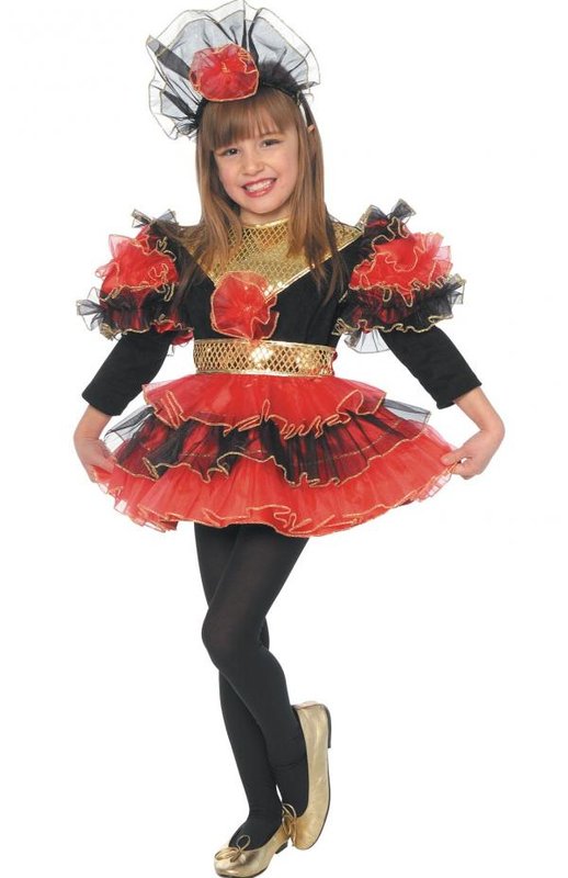 Součástí kostýmu je čelenka a šaty. Krátké šaty mají na červené sukni našity volány. Vrchní a spodní volán je z červené průhledné látky, prostřední volán je z černé průhledné látky. Všechny volány jsou lemované zlatě. V pase je pruh zlaté flitrové látky. Vrchní díl je černý se zlatým flitrovým trojúhelníkem místo výstřihu. Na jeho špičce je našita červenozlatá kytka. Černé dlouhé rukávy mají vrchní část červenou nabíranou s našitými zlatě lemovanými volány. Jeden je červený a dva jsou černé. Kostým je doplněn čelenkou s volánkem z černé průhledné látky lemovaným zlatě a červenozlatou kytkou.