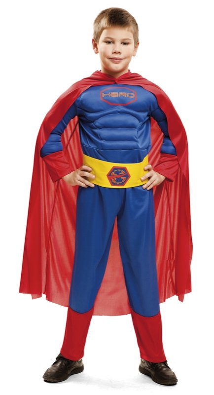 Součástí kostýmu je plášť, overal a pásek. Tmavomodrý overal s dlouhými rukávy, které mají širokou červenou manžetu. Hrudník i ruce jsou mírně vycpané s naznačenými svaly. Uprostřed hrudníku je červený nápis HERO. Kalhoty mají ve spodní části červené široké manžety. Kolem pasu je žlutý pásek s barevným znakem. Kostým doplňuje červený dlouhý plášť se zapínáním pod krkem.
