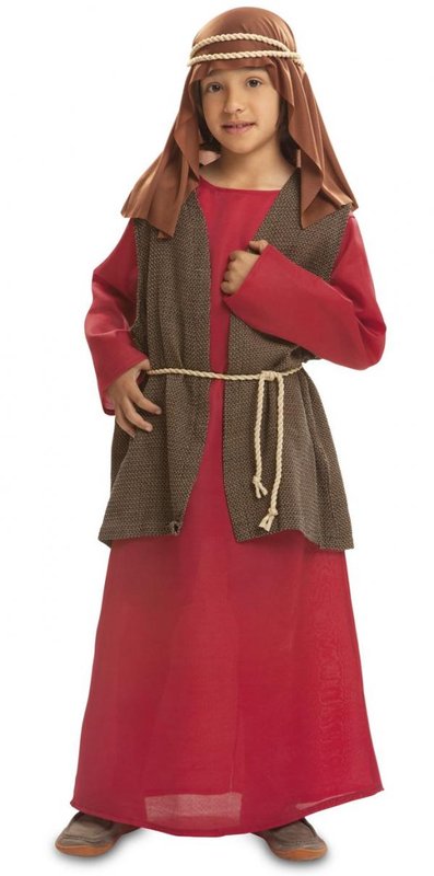 Součástí kostýmu je dlouhá červená róba s dlouhým rukávem, tmavohnědá dlouhá vesta, hnědý šátek na hlavu. Kostým je doplněn krémovým šňůrovým páskem a čelenkou.