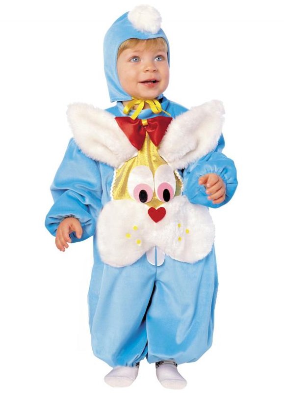 Součástí kostýmu je overal a kapuce. Modrý sametový overal má na břiše našitou velkou zaječí hlavu. Uši a tváře jsou z chlupaté bílé látky. Hlava je lesklá zlatá s velkýma bílorůžovočernýma očima. Na vršku zaječí hlavy je přišita červenožlutá mašlička. Jako čumáček je červené srdíčko. Hlava je doplněna dvěma zaječími zuby a žlutými tečkami na tvářích. Na kapuci, která se zavazuje na mašličku, je bílá chlupatá bambulka.
