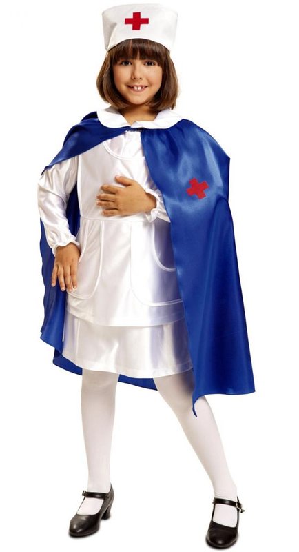 Součástí kostýmu je čepeček, plášť a šaty. Bílé krátké šaty s dlouhým rukávem a límečkem mají bílou zástěrku s kapsami. Tmavomodrý plášť má natištěný červený kříž. Stejný kříž má i bílý čepeček.