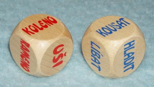 2 kostky 33 mm. Nápisy na jedné kostce jsou: Kousat, Lízat, Hladit, Dotýkat se, Líbat a otazník. Na druhé kostce jsou nápisy: Koleno, Rameno, Uši, Ruce, Rty a otazník.