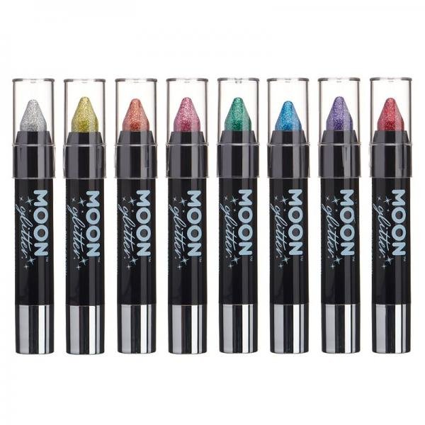 Moon Glitter Body Crayons jsou rychlý a snadný způsob, jak aplikovat třpytky na vaše tělo. Jemný hrot vám umožní vytvořit perfektní obrysy a nechat vás svítit jako hvězda. Naše jedinečná hladká formule odolná vůči potu a vodě odolná znamená, že vaše návrhy vydrží po celý den nebo noc. K dispozici v 8 barvách. V souladu s EU a FDA. Jak používat: Otočte konec a aplikujte špičku na obličej nebo tělo. Odstraňte pomocí líčení.