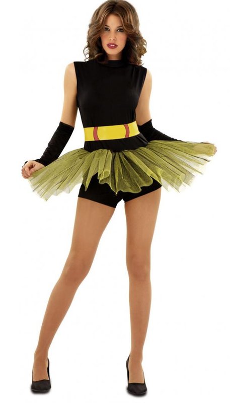 Součástí kostýmu je top, šortky, rukavice, sukně a pásek. Černý přiléhavý top a šortky jsou doplněny žlutým páskem se dvěma červenými proužky a dvojitou žlutočernou nabíranou průhlednou sukní. Ke kostýmu patří i černé dlouhé rukavice bez prstů.