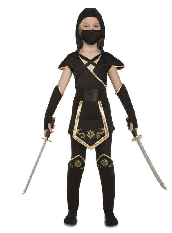 Součástí kostýmu ninja pro dívky je šaty s kapucí, pásek, legíny, maska a rukavice.