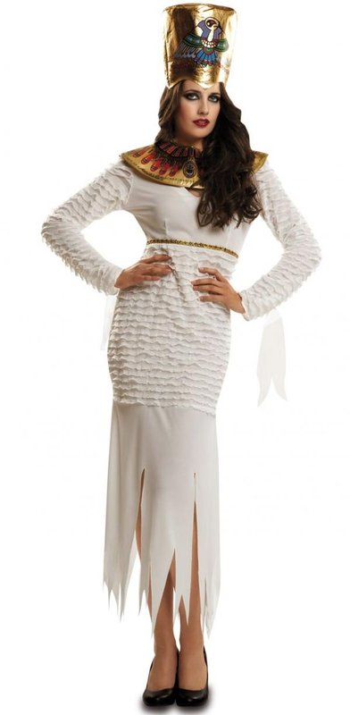 Součástí kostýmu jsou úzké dlouhé bílé šaty v pase zdobené zlatou stuhou. Dlouhé rukávy a vrchní část sukně jsou pošity proužky bílé látky. U zápěstí jsou našity taktéž proužky bílé látky. Šaty doplňuje velký zlatý límec s barevnými motivy. Ke kostýmu patří velká zlatá čepice s barevným motivem .