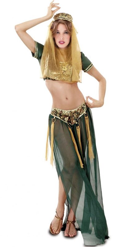 Součástí kostýmu je čepice se závojem, top a kalhotky se sukní. Tmavozelený krátký top s krátkými rukávy je na hrudníku zdoben zlatými ornamenty a vlnitou stužkou, která je i na rukávech. Kalhotky jsou se zlatými ornamenty, lemované zlatou vlnitou stužkou a s kroužky na kterých jsou zavěšeny vždy dva proužky průhledné žluté látky. Ke kalhotkám je přišita dlouhá tmavozelená průsvitná sukně s hlubokými rozparky na obou stranách. Kostým doplňuje čepice se zlatými ornamenty, ke keteré je přišit žlutý průhledný závoj.