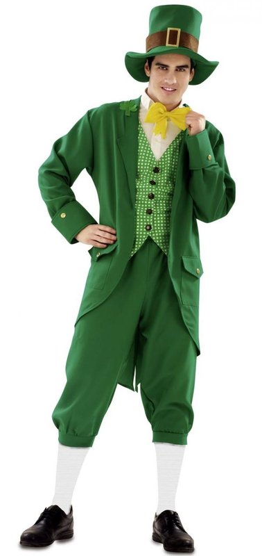 Součástí kostýmu je klobouk, přední díl košile, mašle, vesta, žaket a kalhoty. Bílý přední díl košile s límečkem je doplněn žlutou mašlí. Tmavozelený žaket s klopami, kapsami a manžetami, které mají ozdobný knoflíček. Na klopě je přišit trojlístek. Ve stejné barvě jsou i 3/4 kalhoty. Kostým doplňuje zelenobílá kostkovaná vesta s černými knoflíky a zelený klobouk s hnědým páskem se zlatou sponou.