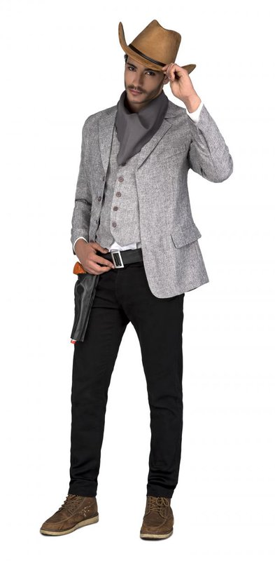 Součástí kostýmu je žaket, vesta, šátek a pásek s pouzdrem na pistoli.