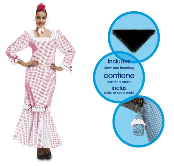 Součástí kostýmu je šátek na hlavu, kabelka, šátek a šaty. Dlouhé úzké bílé šaty s dlouhými rukávy jsou posety malými růžovými puntíky. Nad koleny, kolem výstřihu a zápěstí jsou malé krajkové volánky provlečené růžovou stužkou. Na kolenou jsou dvě malé mašličky. Od kolen dolů je sukně rozšířená. Kostým doplňuje bílý šátek na hlavu, černý trojcípý šátek přes ramena s třásněmi a malá taštička do ruky ve stejném designu jako jsou šaty.