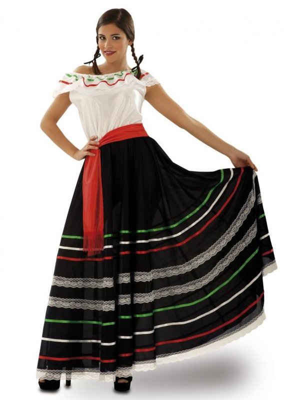 Součástí kostýmu je šerpa a šaty. Dlouhé šaty s černou širokou sukní mají bílou vrchní část, která má spadené rukávy a kolem celého výstřihu velký bílý volánek s červenou a zelenou stužkou. Sukně má na spodním lemu a uprostřed vodorovné proužky bílé krajky. Jako další ozdoba sukně jsou bílé, červené a zelené proužky kolem celé sukně. Kostým doplňuje červená šerpa s třásněmi.