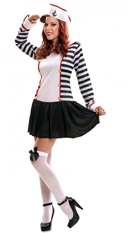 Součástí kostýmu je čepice a šaty. Krátké šaty mají černou skládanou sukni. Vrchní díl je černobílý pruhovaný s širokým bílým pruhem na hrudníku, který je lemován červenou stuhou a zlatými knoflíky. Dlouhé pruhované rukávy mají bílou manžetu lemovanou červeně. Ve stejném designu jako manžety je i námořnický límec a čepice, která má natištěnou černou kotvu.