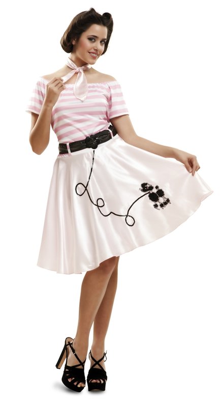 Součástí kostýmu jsou šaty, pásek a šátek. Šaty mají vrchní díl bílorůžový pruhovaný se spadenými rameny a s krátkým rukávem. Světlerůžová kolová sukně je zdobená černým pudlem, od kterého vede vodítko až k pasu. Šaty jsou doplněny černým páskem se sponou a světlerůžovým šátkem kolem krku.