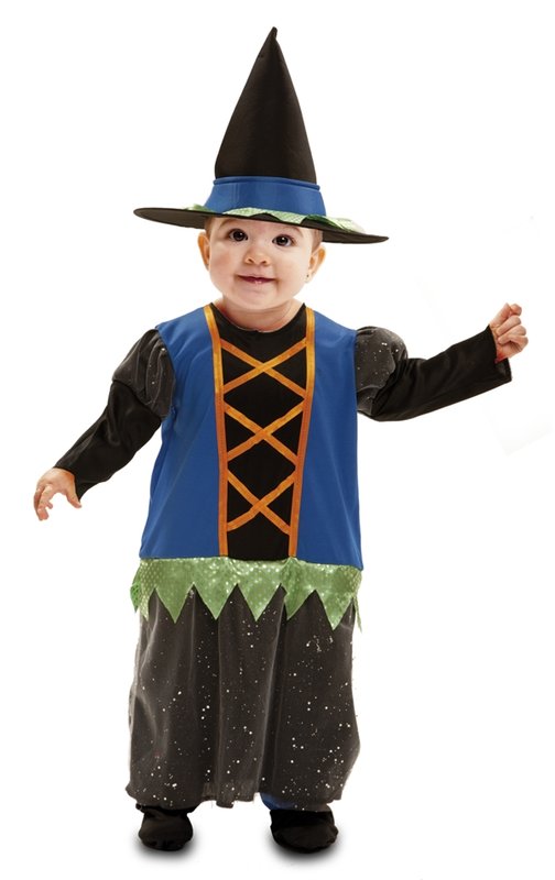 Součástí karnevalového kostýmu pro minka - kostýmu čarodejnice je overal a klobouk. Tmavomodrý overal má černé dlouhé rukávy. Vrchní část rukávů je z černé látky s bílými tečkami. Na hrudníku je černá vsadka zdobená oranžovým šněrováním. Kolem pasu je našitá zelená flitrová látka nastříhaná do malých cípů. Spodní díl tvoří černá sukně s bílými tečkami. Kostým doplňuje černý čarodějnický klobouk s modrým pruhem a zeleným flitrovým volánkem.