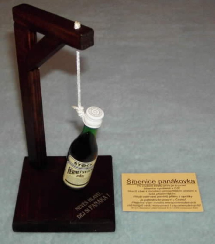 Šibenice s oběšenou prázdnou lahvičkou (0,05 l). Proč se věšet, když se dá uchlastat. To je příjemnější smrt!