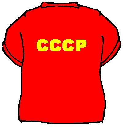 Nápis na tričku - CCCP - přes celá záda a vpředu malá hvězda, srp a kladivo a pod tím malý nápis CCCP.