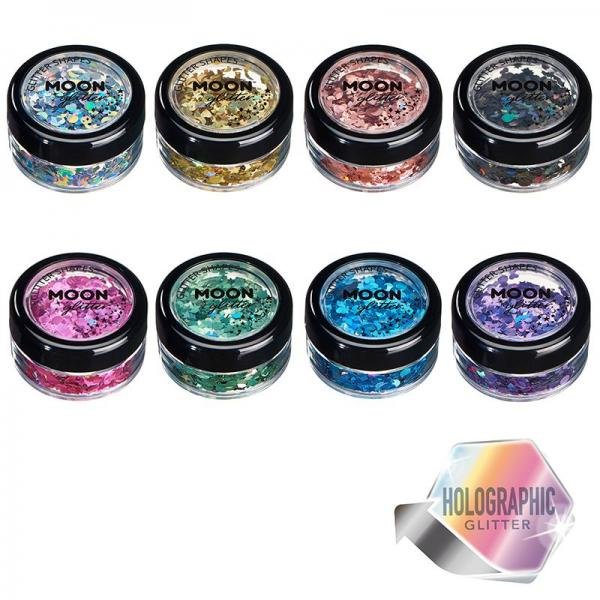 S našimi holografickými třpytkami získejte další rozměr. Hvězdy, tečky, srdce, půlměsíce a diamanty. Naše třpytky jsou kosmetické třídy, takže se dokonale bezpečně nanášejí na obličej, vlasy a tělo a lze je snadno odstranit pouze vodou. Dodáváno v uzavíratelném kalíšku ve velikosti do kapsy. Použijte třpyt, který doporučujeme použít Moon Glitter Fix Gel, lepidlo na rty, vlasové nebo nehtové lepidlo.