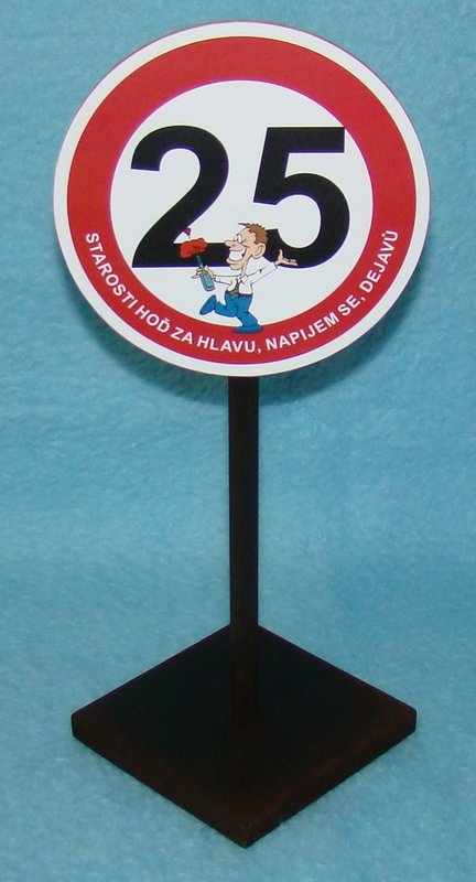 Dopravní značka jako dárek k narozeninám. Průměr značky 14 cm. Výška 33 cm.