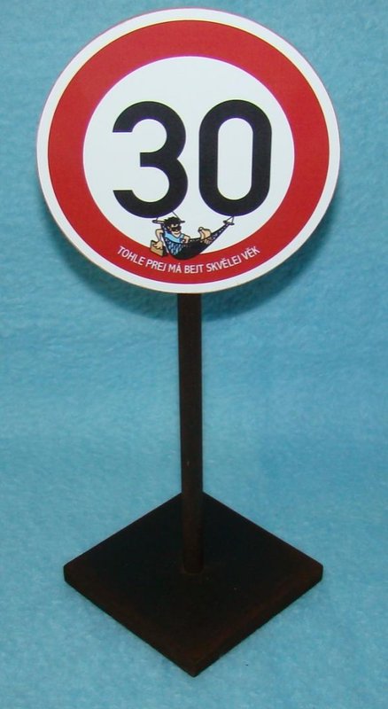 Dopravní značka jako dárek k narozeninám. Průměr značky 14 cm. Výška 33 cm.