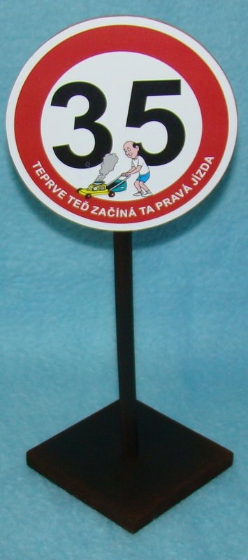 Dopravní značka jako dárek k narozeninám. Průměr značky 14 cm. Výška 33 cm.