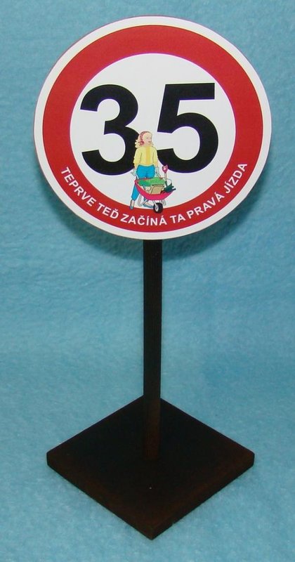 Dopravní značka jako dárek k narozeninám. Průměr značky 14 cm. Výška 33 cm.